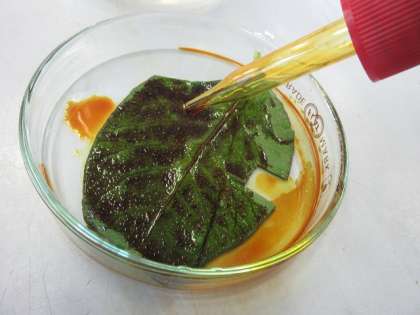 最後に,葉にヨウ素液をつけてデンプンがあるのか調べます。