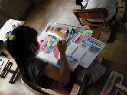 子どもたちは,色を混ぜてオリジナルの色を作ったり,水の量を考えて濃淡を楽しんで塗ったりと,学習に一生懸命にむかっていました。
