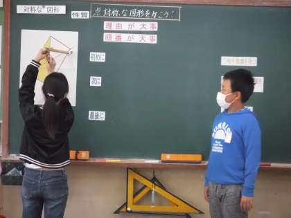 算数の学習では,「対称な図形」の点対称の図形のかき方について学習しました。