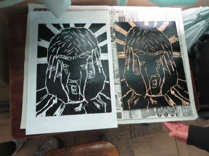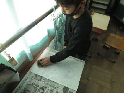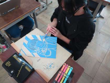 彫刻刀で彫り終わり,インクを使って刷る活動をしています。