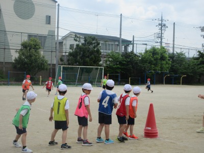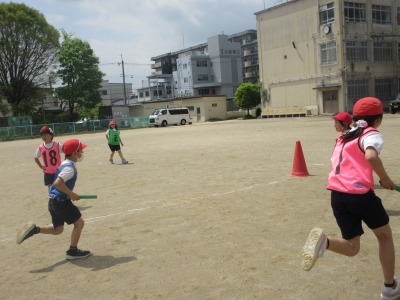 体育の学習では,リレーをやっています。