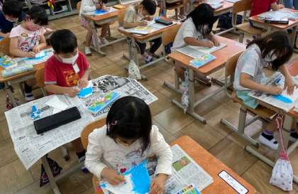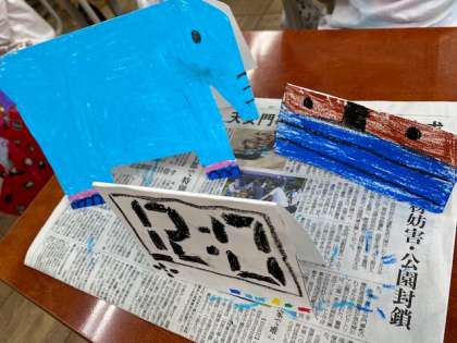 図工の学習で,画用紙を折って立てて作品を作りました。