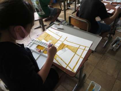 山の家の絵を絵の具で塗り始めました。