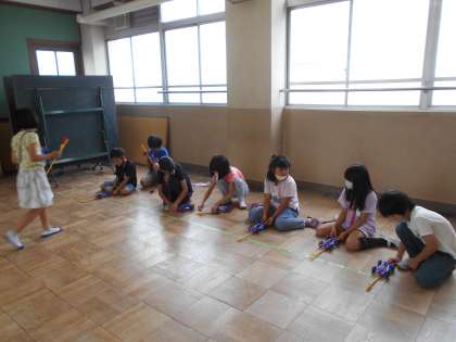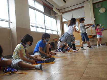 ゴムで動く車を作って遊び,気が付いたことを話し合いました。