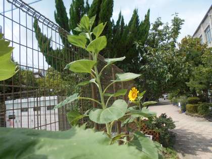 ヒマワリ,ダイズ,オクラ,ホウセンカが見事に花を咲かせ,実をつけています。