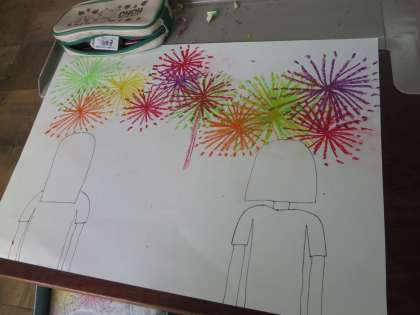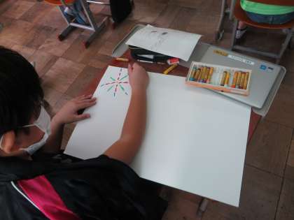 クレパスや絵の具を使って