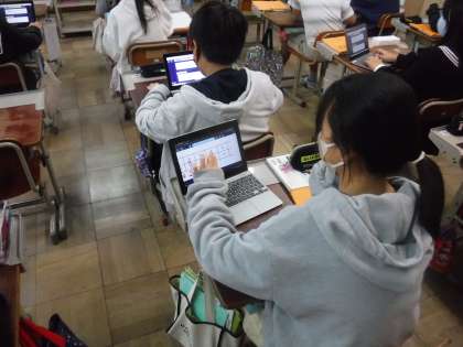 タブレットにかかれた表に、ペンの機能で書き込み、ペアで説明しあっていました。