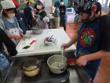 各担当に別れて、グループのご飯とみそ汁をつくり