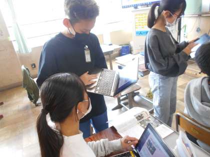 今年の学習も,GIGA端末やロイロノートを使って進めています。調べ学習やペア学習など子どもたちも積極的に取り組んでいます。