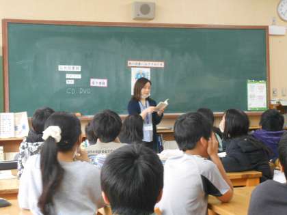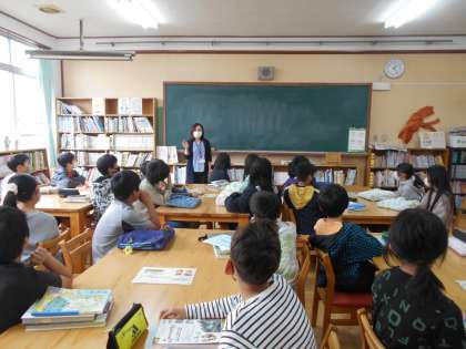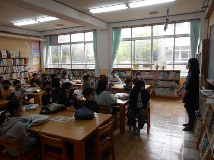 司書教諭の豊田先生に図書室の使い方やおすすめの本を教えてもらいました。これからの学習が楽しみですね。