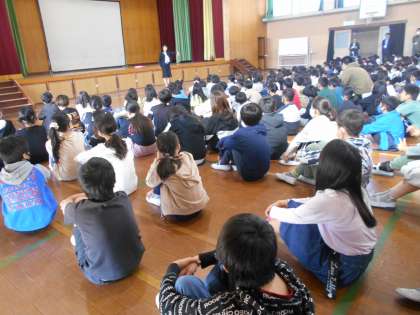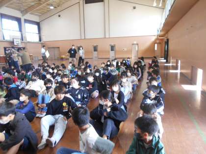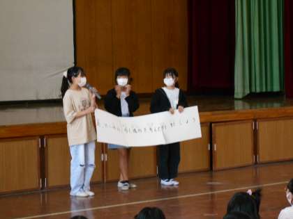 1時間目に朝会をしました。今回から全校生徒が体育館に集まって行っています。6年生の子どもたちは,姿勢よく話を聞くことができていました。計画委員からの発表も上手くできていました。