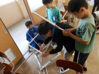 図工科「つなぐんぐん」の様子です。新聞紙を棒状に丸め、友達と協力しながら棒と棒をつなぎました。立体をどのように組み立てるといいのかなど考えながら、楽しく取り組むことができました。