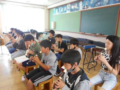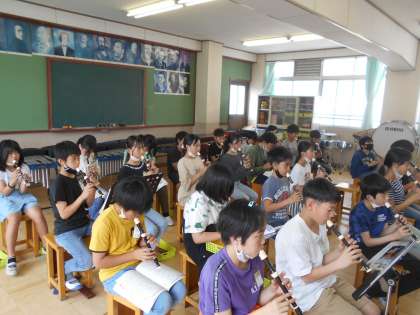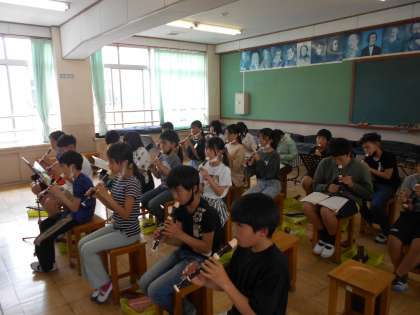 音楽の時間にリコーダーの演奏をしています。「メヌエット」という曲をリコーダーの指使いに気をつけて練習しています。