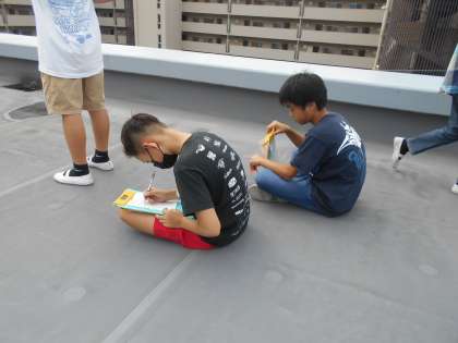 今日は校舎の屋上に上がって月の観察をしました。先週見た月の位置とどのように変わっているのか、確認することができました。