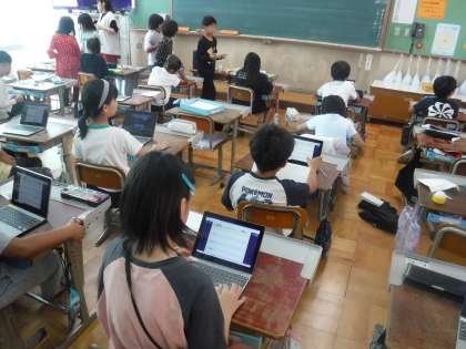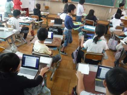図工の学習では、運動場の木や葉っぱから見つけた形や色をロイロノートでまとめる活動をしました。