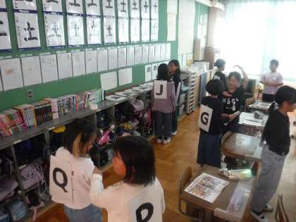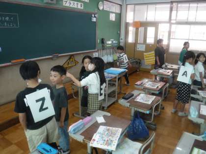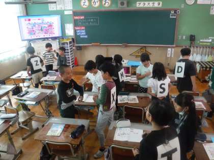 今日の外国語活動では、自分の背中に張られたアルファベットをみんなで相談しながら当てるゲームをしました。