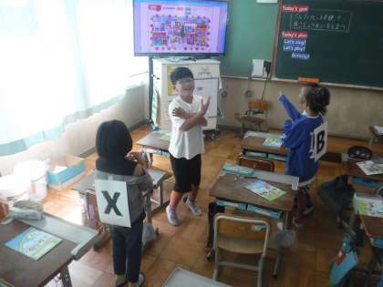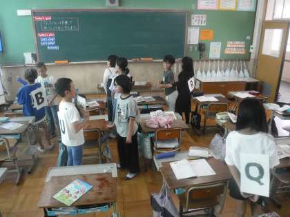 自分の背中にはどのアルファベットがあるか、みんなでヒントを出し合いながら、一生懸命考えていました。