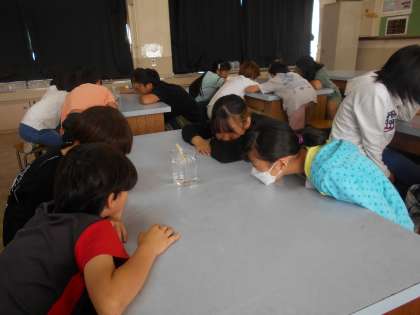 班に一つのビーカーを目線を合わせて小さくなって
