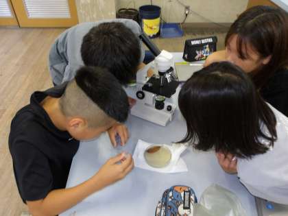 川にいる魚は,何を食べているのかを調べるために,川の水を顕微鏡で見ました。見た目は,濁った水にしか見えないけれど,顕微鏡を覗くと,「うわーっ。」という歓声が。長細い形をしたものや,目があるものなど,たくさんの微生物がいました。