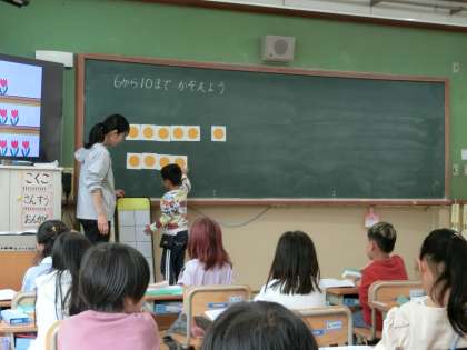 算数では1から10までの数をよんだり数えたり、書いたりという学習をしています。数えるのは簡単でも数字を書くのはむずかしい!あわてずゆっくり覚えていきましょう。