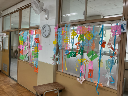 色紙を折って切って、いろいろな形を作りました。それをつないで、かざりに仕上げました。一人ひとりの作った面白い形やきれいな形が並んで、とてもすてきなかざりになりました。