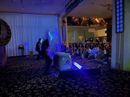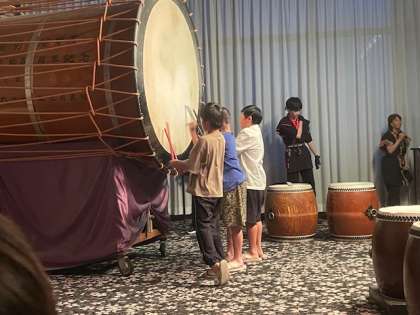 ホテルの方が鷲羽太鼓を披露してくださいました。世界で2番目に大きい太鼓の音は迫力満点でした。途中、子どもたちに太鼓を叩かせていただく場面もあり、大喜びな6年生です。