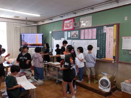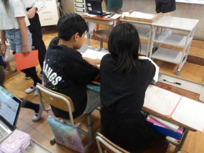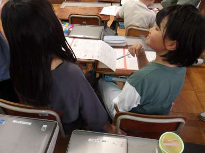 国語の学習です。「銀色の裏地を」読んで、登場人物の気持ちや疑問について深めるため、友だちと交流しました。子どもたちは、ペアを変え、話をしていくうちに、考えを深めていきました。先生たちがたくさんいる中でしたが、よくがんばった子どもたちです。