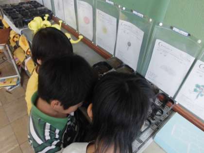 理科の学習では,ひまわりとホウセンカを育てます。たねまきをして,ポットにいれて教室で観察しています。「水いれすぎたかな」「土の量これくらい?」と班で協力しながら活動できました。