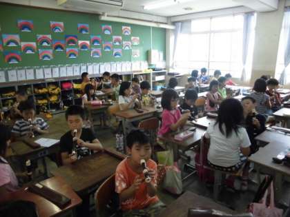 三年生からはじまったリコーダーに,子ども達は奮闘中です。グループで練習したり,ペアで聞きあったり…いろいろな活動を通して,正しい音色を学習中です。今日は日曜参観に見ていただいた「シ」「ラ」の音に加え,「ソ」がはいりました。新曲の「ゆうやけこやけ」がみんなそろって,きれいに響くようになりたいですね。