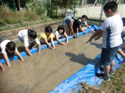 稲の苗がどんどん育ってきました。そこで,田植えをする準備として,田に水を張り,草を抜いたり,手で100回ずつ土をほぐしました。田植えに向けての準備が整いました。これからが楽しみです。
