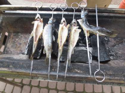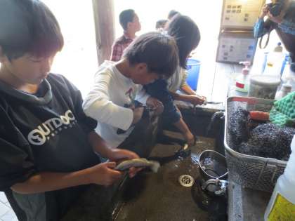 魚つかみをした後、魚の調理をしました。魚の内臓などを取り除く作業の時には、「気持ち悪い。」「こんなこと初めてだ。」という声が多く聞こえました。野外炊事の後に、「命をいただいていることへの感謝をしながら食べた。」と話す子がいました。
