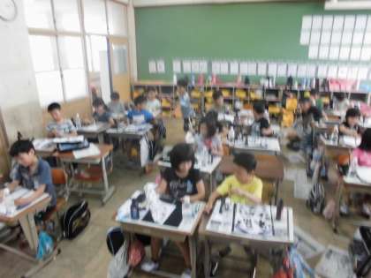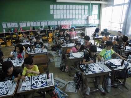 3年生では,書写の学習で,はじめて習字をしました。はじめて使う道具に子ども達は大興奮。道具の名前も少しずつ覚えていってほしいと思います。はじめて使う筆で,とめ,はね,はらいを意識して線を書きました。金曜日には「一二」を書く予定です。