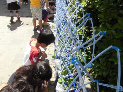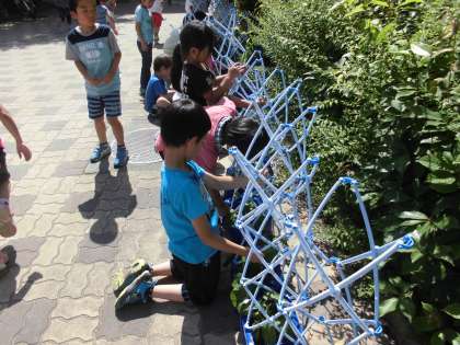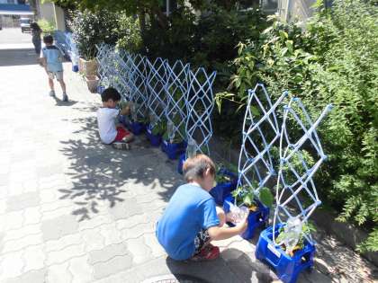 ここ何日かの適度な雨と暖かい気候で,1年生の育てている朝顔が良く育っています。今日は,伸びた蔓が絡まらないようにと支柱を立てました。この土日でもきっとぐんぐん育ってくれるでしょう。