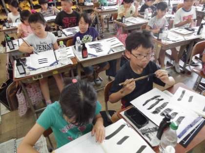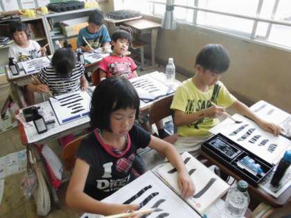 二回目の習字の時間には,半紙に「一二」と書きました。バランスを意識して書きましたが,はじめての筆で書く文字に苦戦している様子でした。これから一年間,たくさん書いて,慣れてほしいと思います。