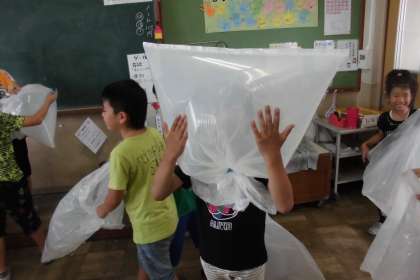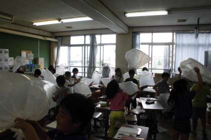 今日は,ポリ袋に空気をためて,感触などを確かめました。