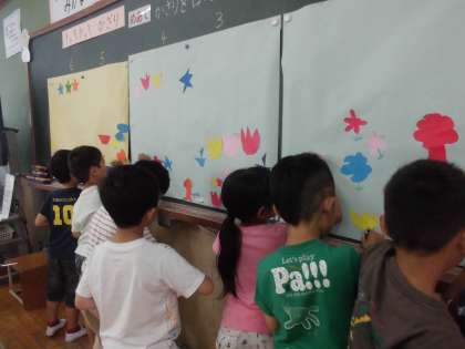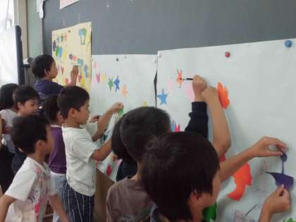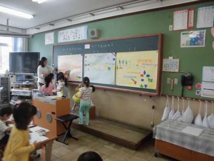 色紙を何枚か重ねて,鋏で切りました。今日はその切った形を並べて貼り,友だちの作品と合わせての,楽しい飾りを作りました。自分だけの飾りよりもみんなと創る楽しさを味わうことができました。