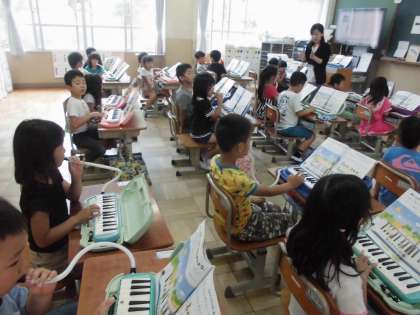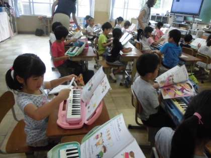 いよいよ「けんばんハーモニカ」の学習が始まりました。“けんばんハーモニカくん”から1年生にお手紙が届き,けんばんハーモニカが上手になる秘訣を教えてくれました。みんながその通りに吹いて,初めてでもきれいな音が出ました。