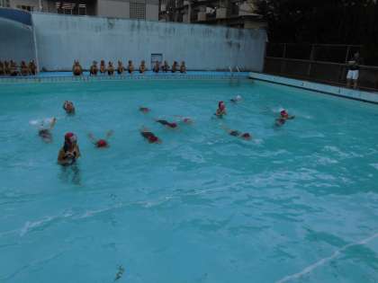 「ロケット」になったり「いるか」になったり「だるまさん」になったりして,水にたくさん慣れてきました。次は水の表面で手と足を伸ばして浮くようにがんばってみました。