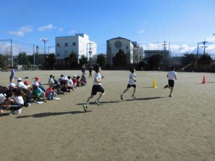 いよいよ水曜日は持久走記録会です。5年生と一緒に運動場を使いながら,練習をしました。「やっぱり5年生はやい!」「でも負けへん!」と一生懸命走りました。走るたびにタイムがあがる子もおり,自分との戦いを楽しんでいます。