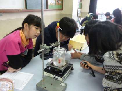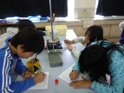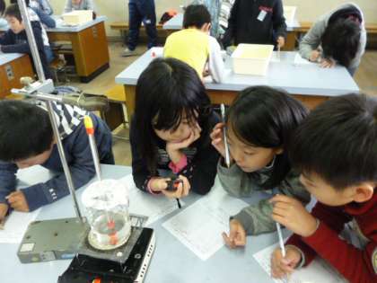1分ごとの温度と水の様子を観察しました。水が沸騰する様子・沸騰している間の温度は変わらない(約100度)ことを学習しました。