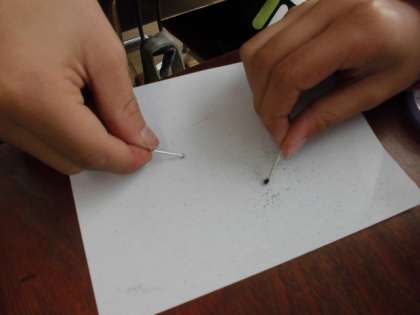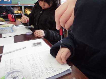 理科の学習では,じしゃくにつけた鉄が,じしゃくになるのかどうか調べました。じしゃくから離しても,くぎが離れないことに,子どもたちはびっくり!楽しい実験になりました。