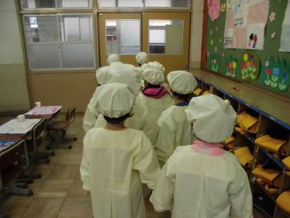 はじめは,どうやってするのかわからず,6年生のお兄さん・お姉さんに手伝ってもらっていました。けれども,どんどん給食当番が上手になっていき,今では,1年生たちみんなで頑張っています。