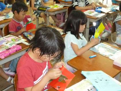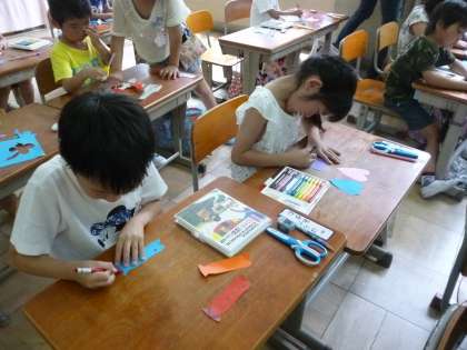 折り紙を重ねて切って同じ形を作ったり,折ってつながるように切ったりして色々な形でかざりを作りました。