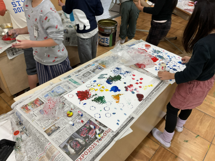 いろいろな形の物をスタンプでうつして作品を作りました。