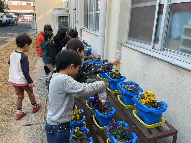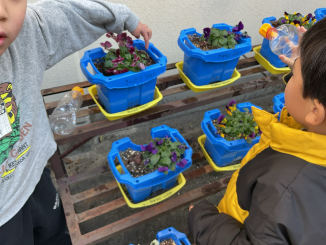 とうれしそうな1年生。冬にもお花を育てる楽しさを感じています。