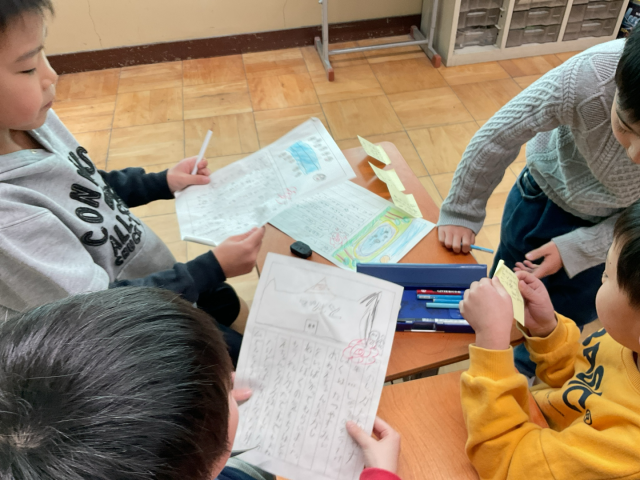 今日は完成した作文を友達と読み合い、感想を伝え合いました。