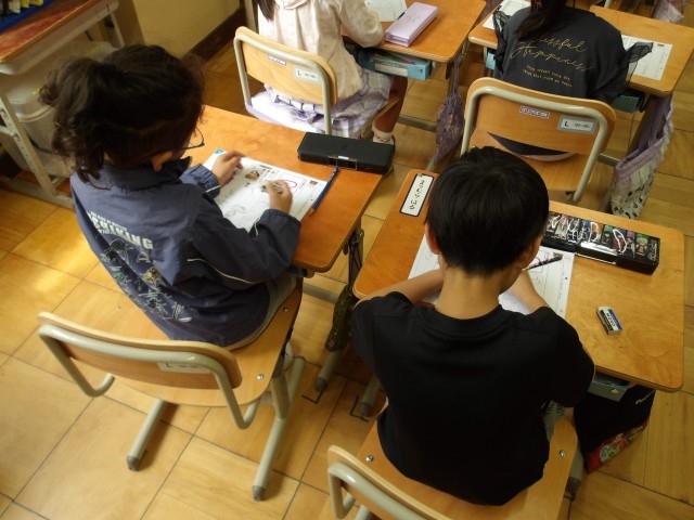 ひらがなの学習です。素敵な姿勢で書く1年生です。姿勢が良いと字が上手になります。