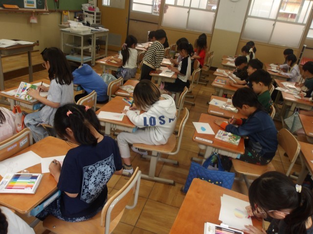 図工の学習では、好きなものを交流し、クーピーで好きなものをどんどんかきました。