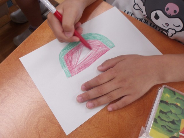 すいかやみかん、うさぎなど自由に描き、一人ひとりの個性があふれる作品が仕上がりました。
