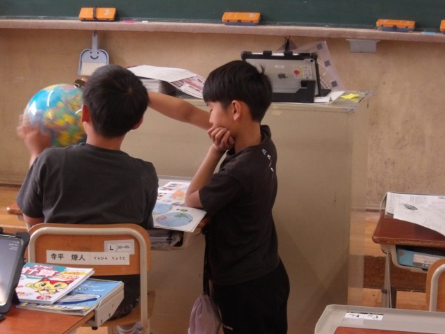 社会の学習です。地球儀を見ながら、世界にどんな国があるのか調べました。